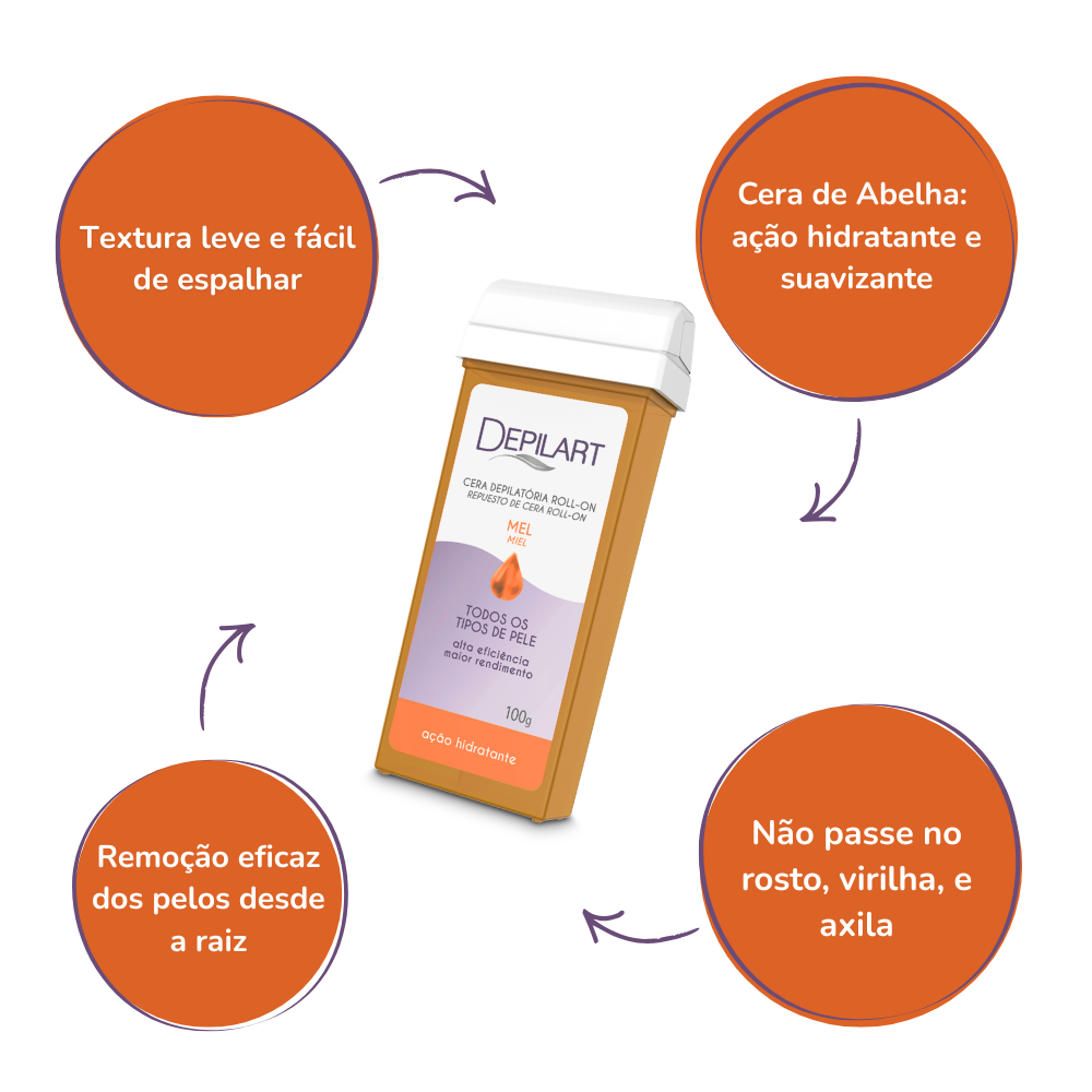 Compatível com cera roll-on, quente ou morna, oferece uma depilação mais eficiente e um acabamento profissional.