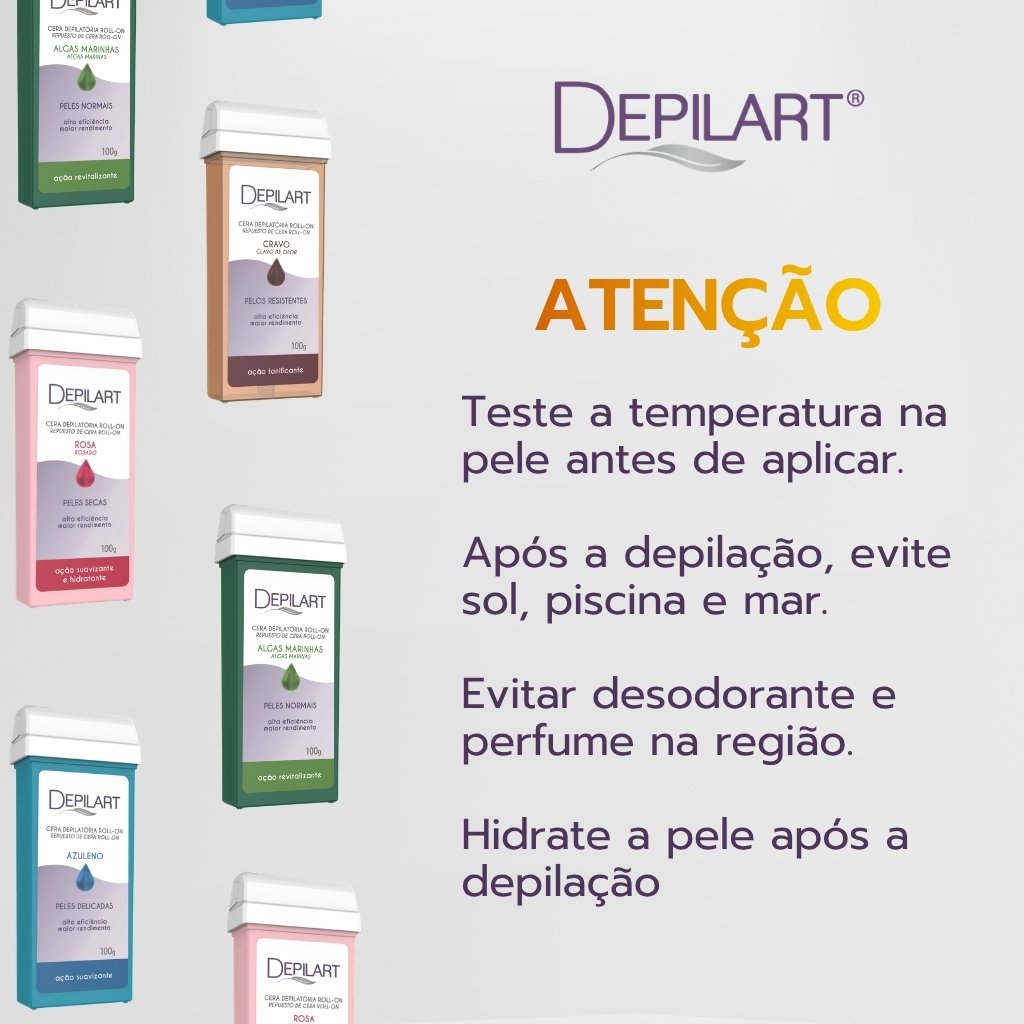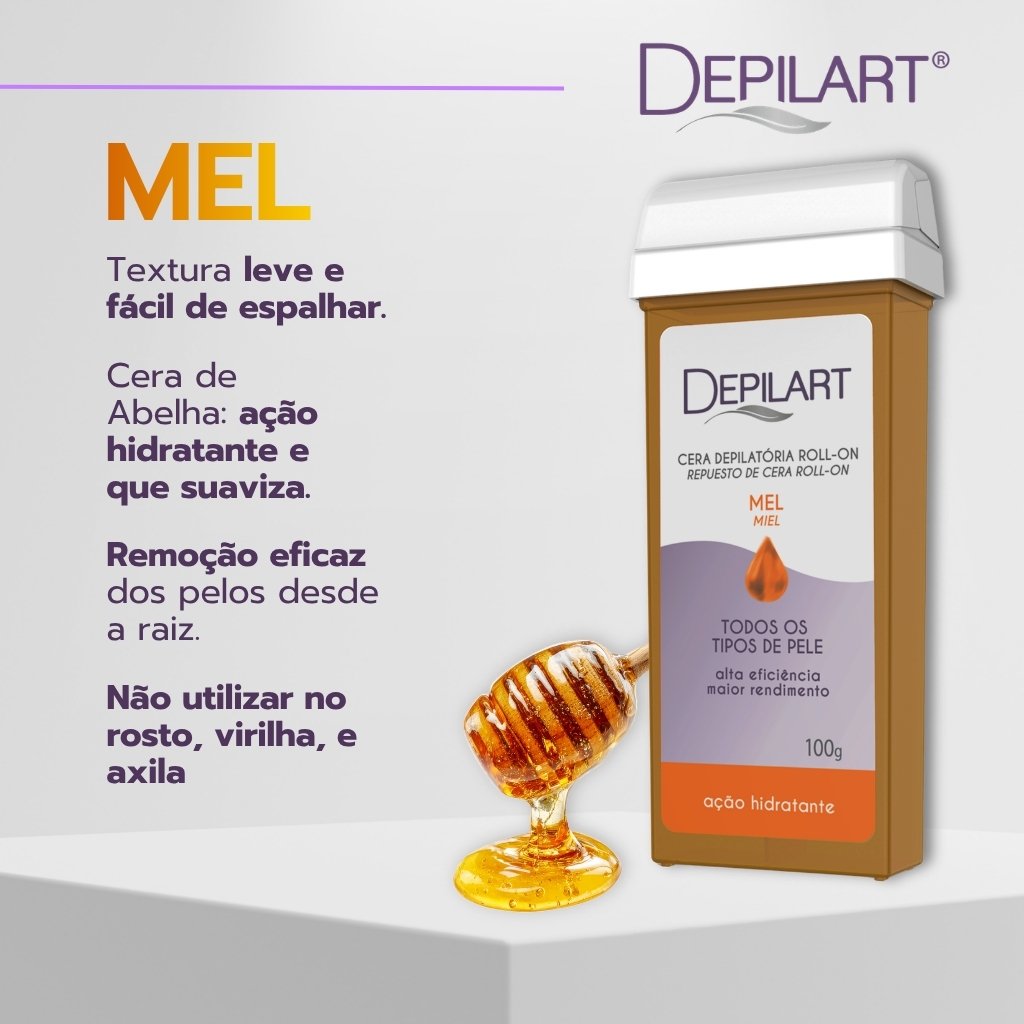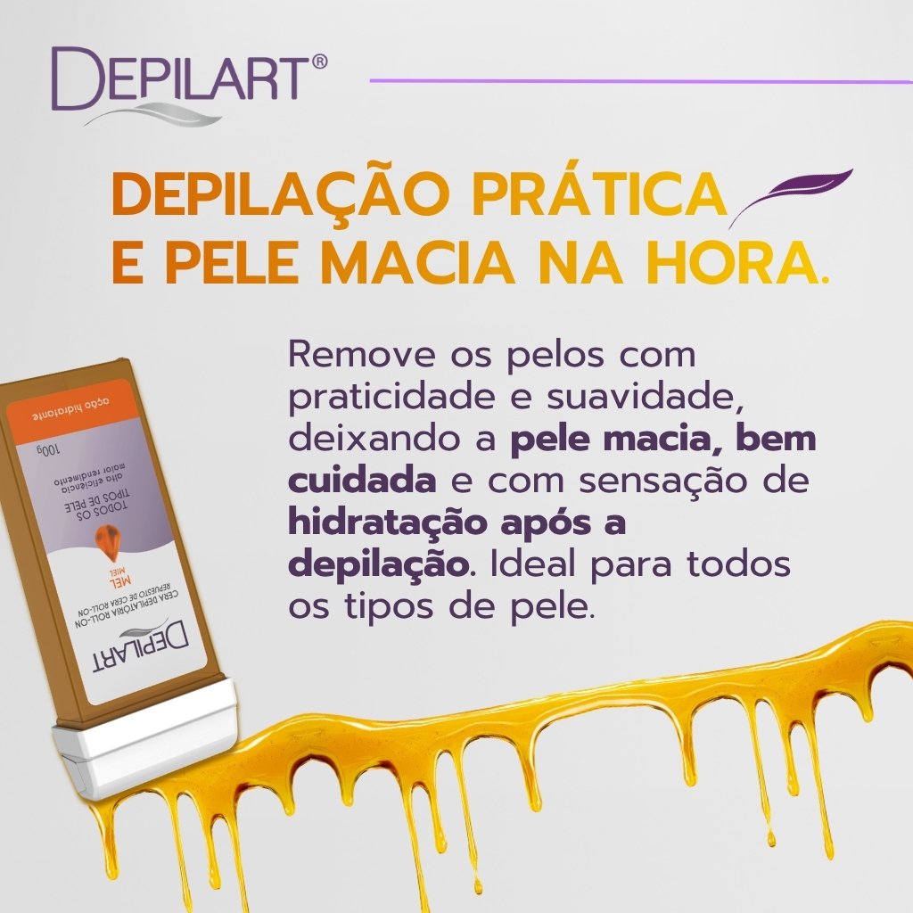 Desenvolvida para uso profissional, a cera roll-on Depilart com extrato de mel oferece alta aderência aos pelos, removendo desde a raiz com eficiência e contribuindo para uma pele mais macia e hidratada após o procedimento.