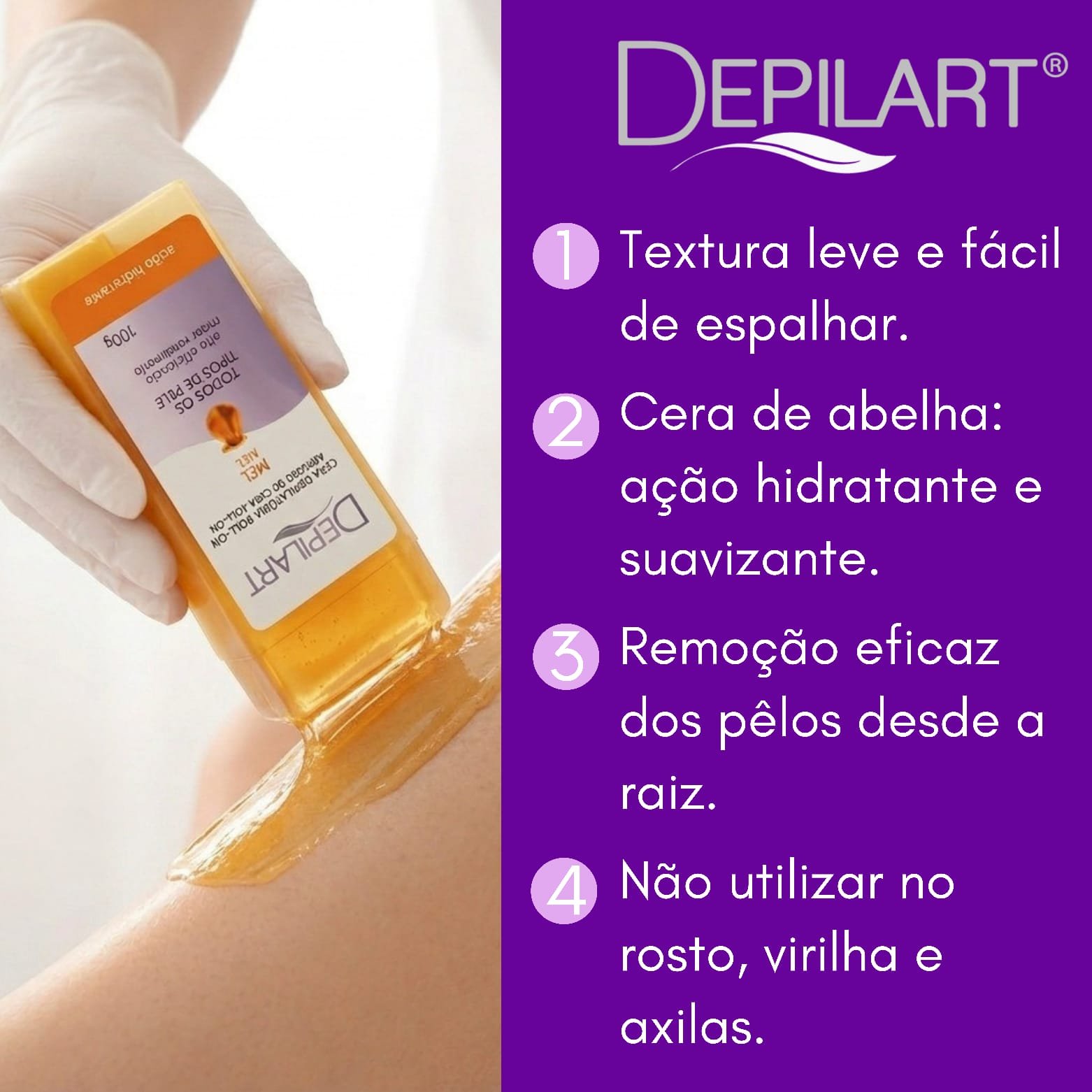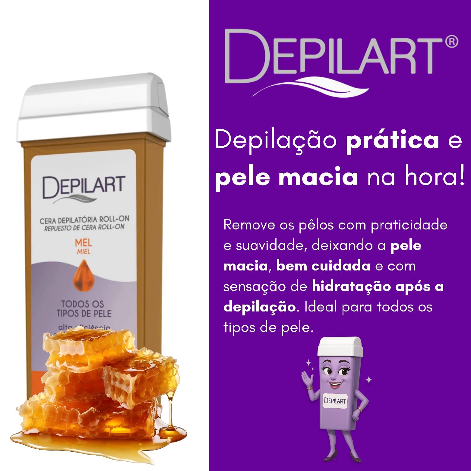 1. Coloque o refil DEPILART no aparelho elétrico sistema Roll-on. 2. Ligue o aparelho na tomada e aguarde aproximadamente 20 minutos. 3. Retire o lacre. 4. Experimente o depilatório na palma da mão para ter certeza da temperatura ideal. 5. Limpe o local a ser depilado com a Loção Pré-Depilatória DEPILART e seque bem. A pele deverá estar limpa, sem resíduos de creme ou suor. 6. Aplique uma camada na direção do crescimento do pelo, formando uma tira. 7. Coloque um lenço para depilação DEPILART sobre o depilatório, fazendo leve pressão para aderir ao pelos. 8. Mantenha a pele esticada com uma mão e puxe o lenço com a outra mão, no sentido contrário ao crescimento dos pelos. 9. Use o mesmo lenço até perder seu poder de aderência. 10. Retire os últimos resíduos do depilatório com o Removedor DEPILART. 11. Para finalizar, use o Gel Hidratante DEPILART para acalmar, refrescar e hidratar a pele.